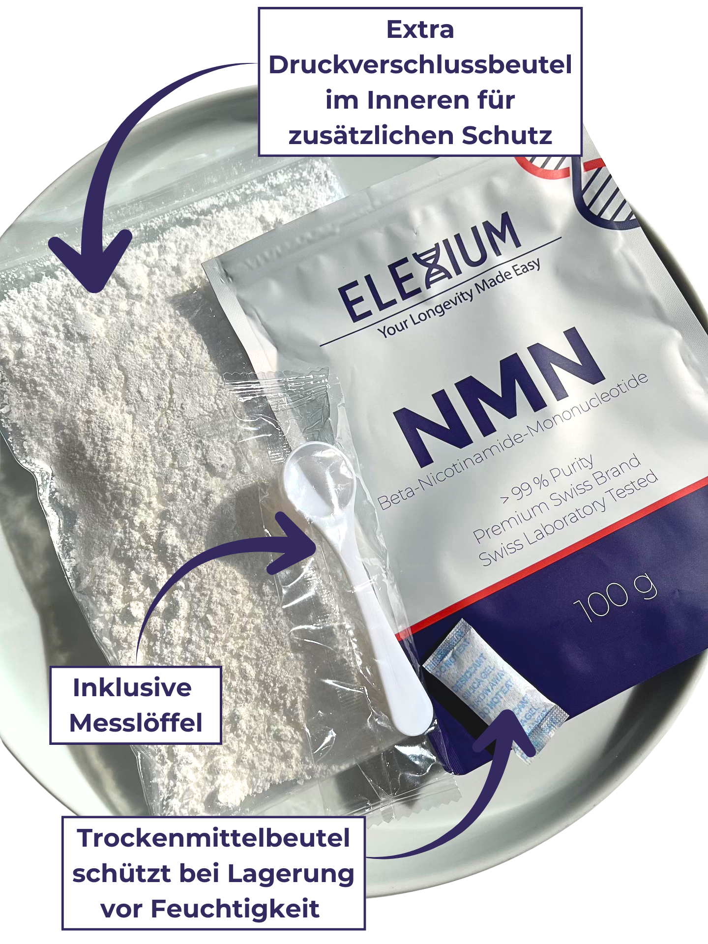 Unser NMN-Pulver wird in einem hochwertigen, lebensmittelechten Standbodenbeutel (PET/ALU/PE) mit Zipper verschweisst.